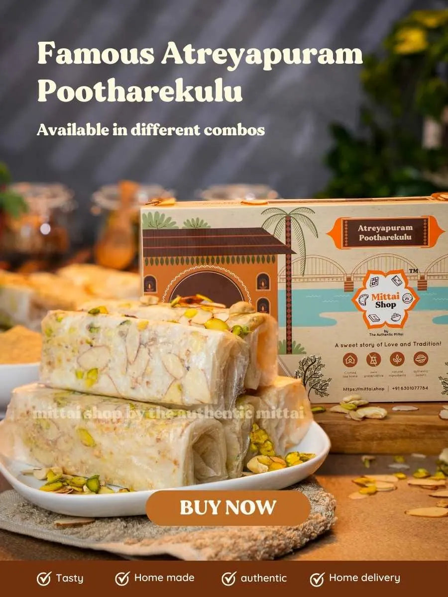 If you are looking for Authentic Pootharekulu from Atreyapuram. You can always buy online from Mittai Shop who are particularly makes Putharekulu in authentic way taking this tradition and culture forward.