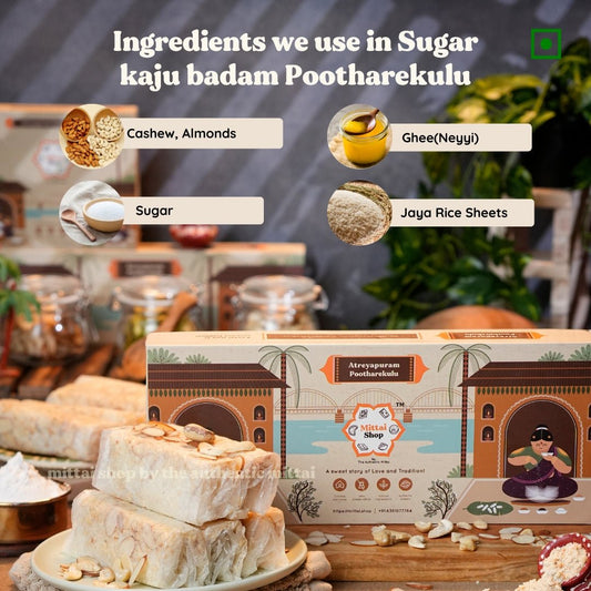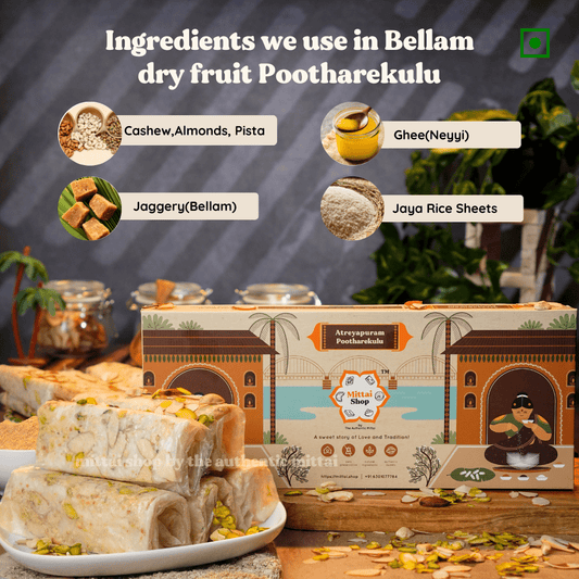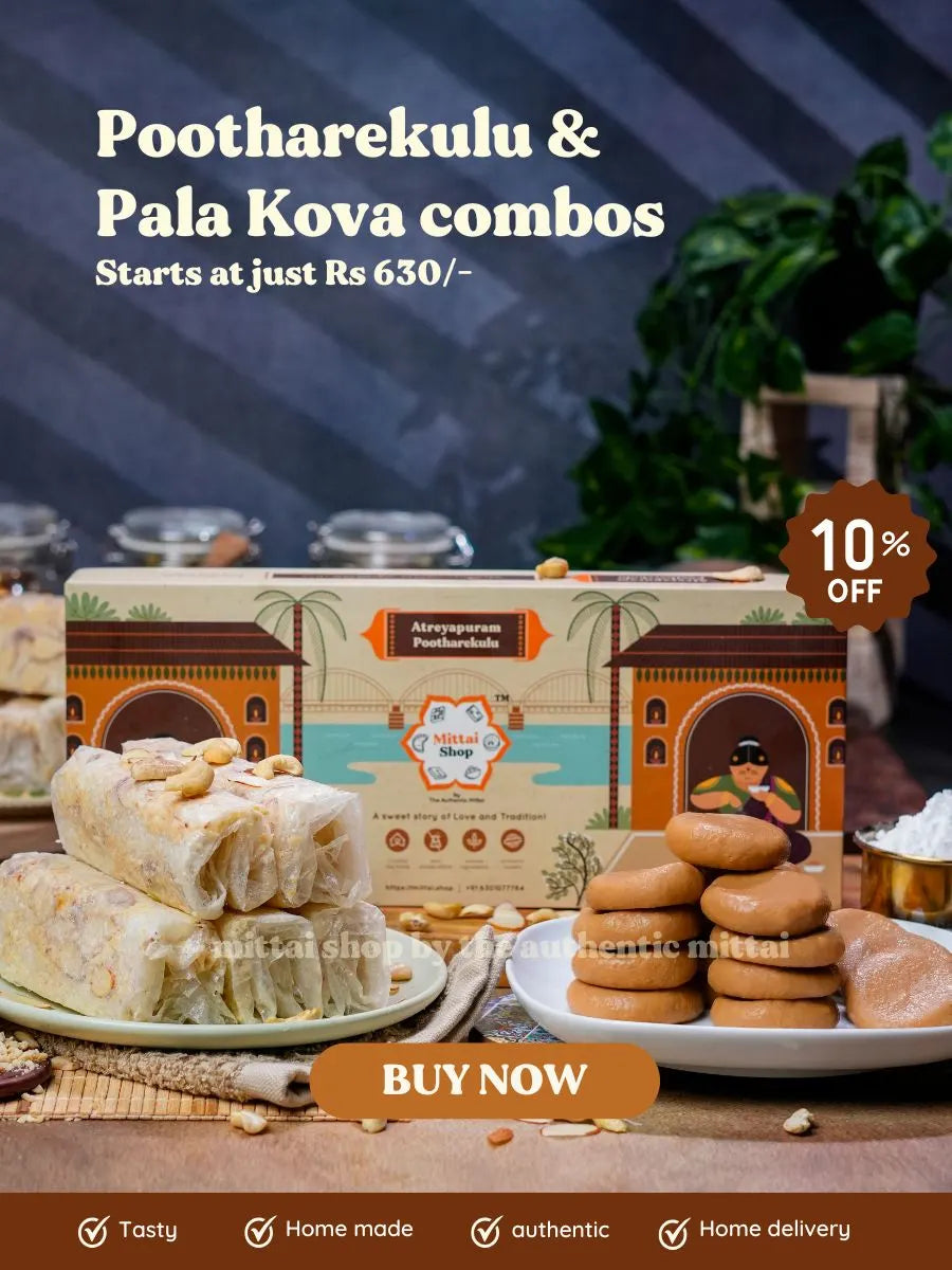 You can order Pootharekulu online through mittai shop's any product or shop page. if you find it difficult to order it online though the website, you can chat with us through Whatsapp(+91 6301077784) or alternatively call us for placing your Pootharekulu order.