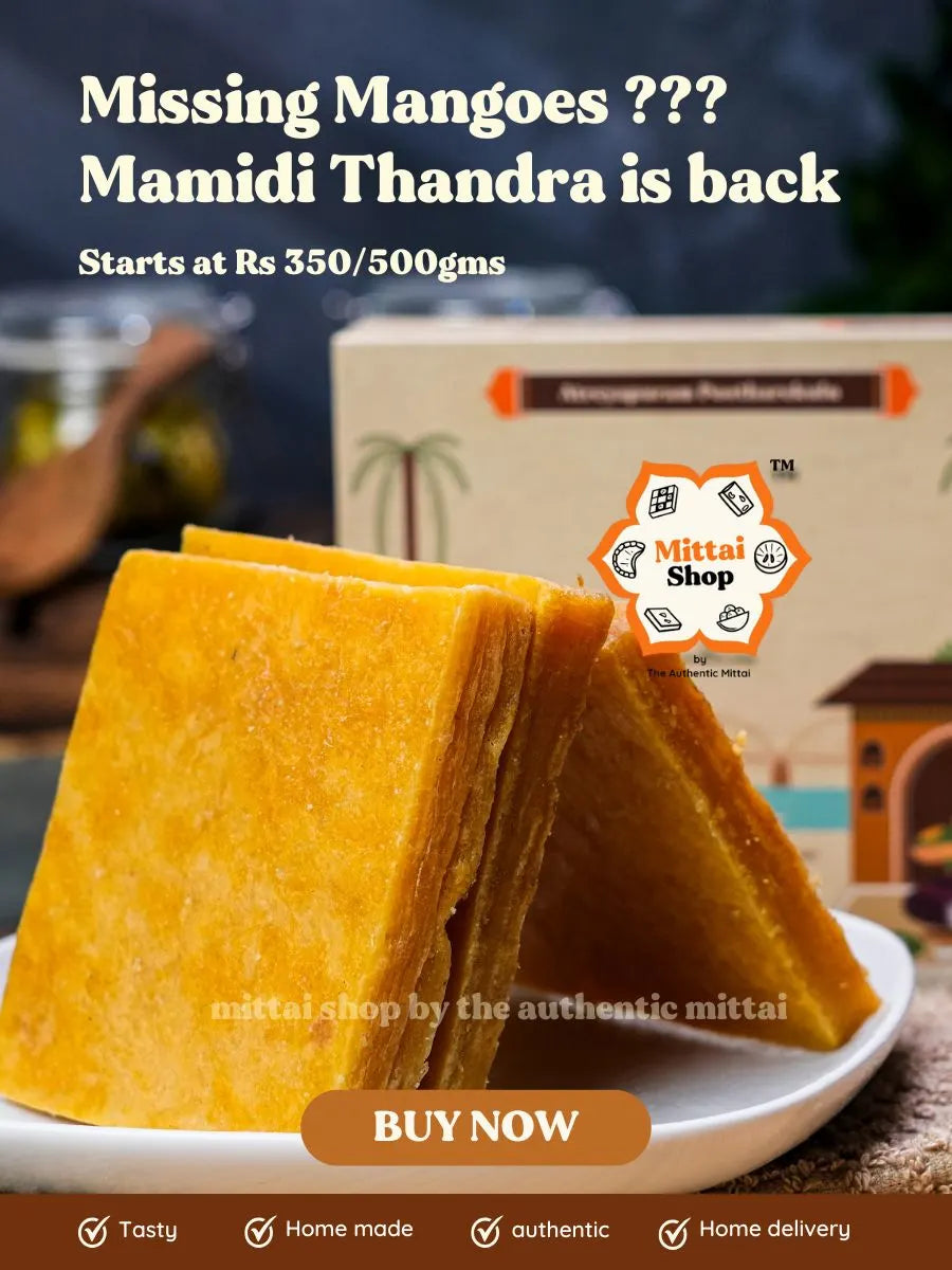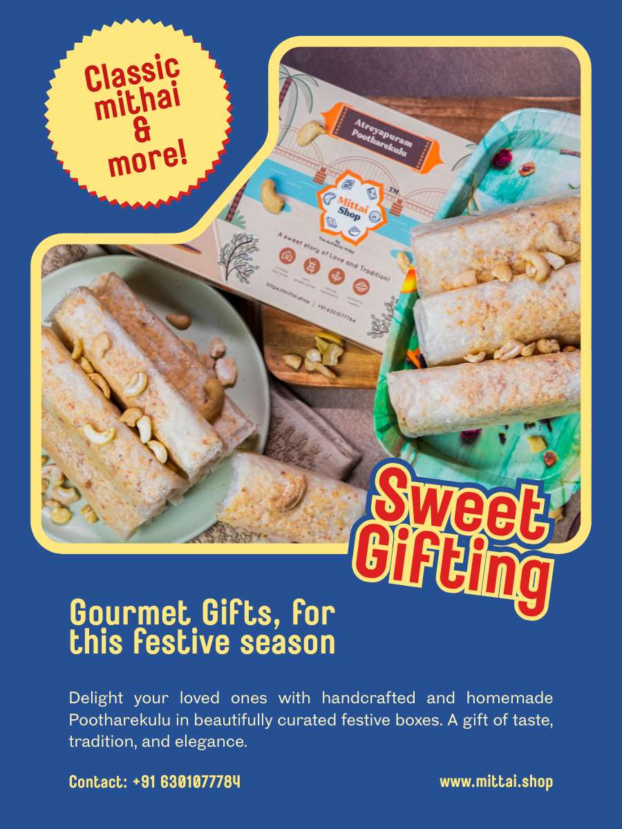 'MITTAI'- A place where one can experience an awesome taste of Indian homemade sweets. We are pledged to provide you with sweets that are made from pure home made ghee and other ingredients. Starting from 'Atreyapuram Putharekulu', a famous sweet from a south east indian village('Atreyapuram'), we will be soon expanding our reach ensuring the delivery of sweets from their origin or well known places directly from their homes to you. Know more
